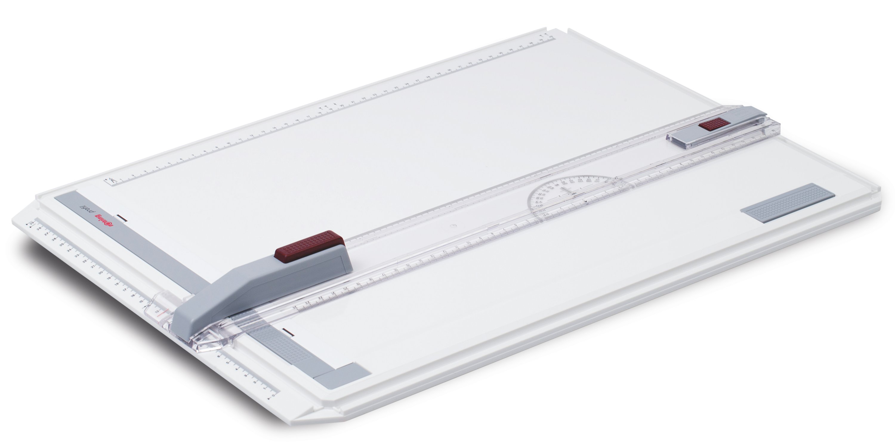 Premium drawing board with L-system straightedge design. Robust board of unbreakable, non-warping material. Parallel straightedge with Stop-and-Go-mechanism. One magnetic clamp strip.